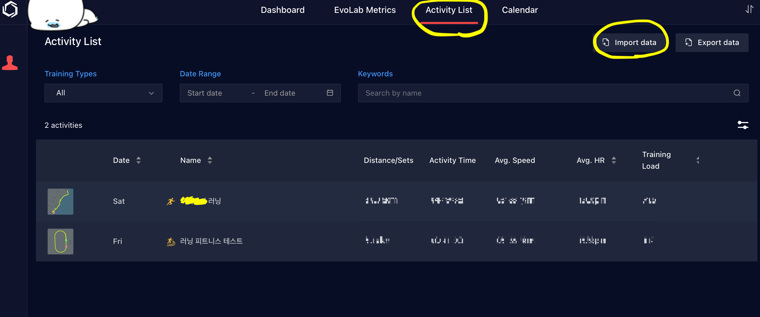 코로스 로그인 -> Workout history ->import data 누르고 2번 폴더에 있는 zip파일 업로드