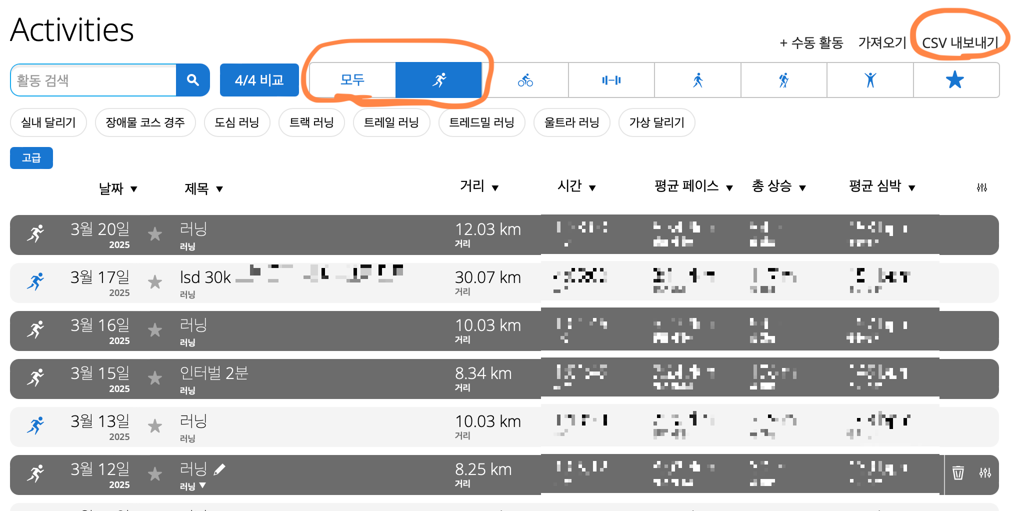 3. 모두 또는 일부 데이터만 선택(해당 아이콘을 클릭하면 파란색으로 색이 변함)해서 우측 상단 'CSV 내보내기' 클릭