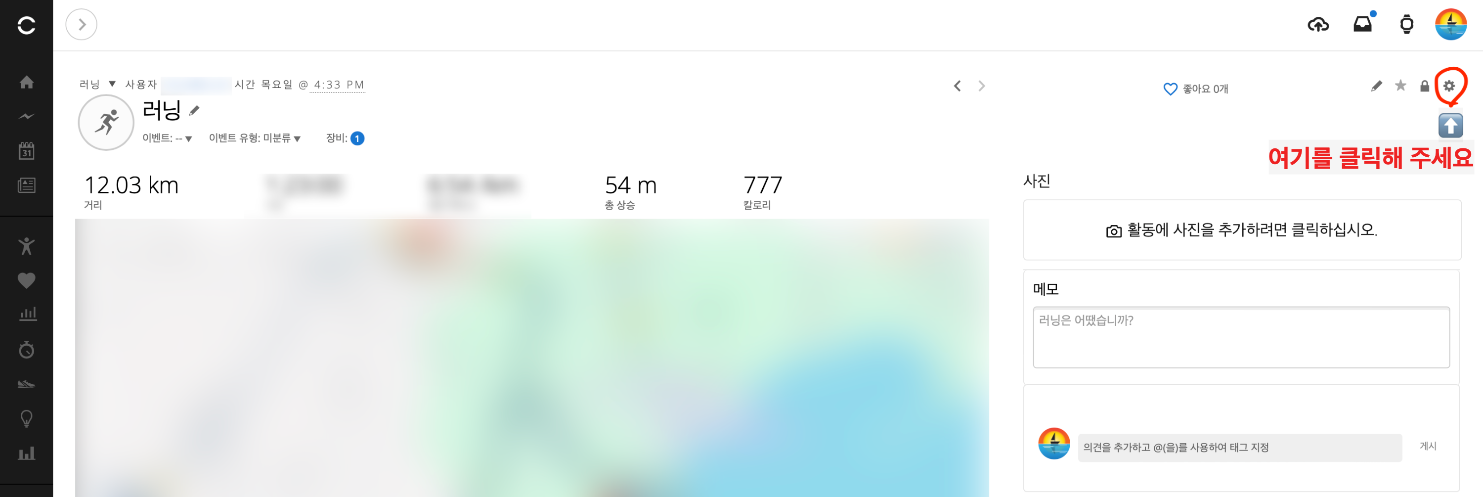2️⃣ 각 러닝 데이터 세부 페이지 들어가서 오른쪽 프로필 아래 톱니바퀴 모양 '설정' 클릭!