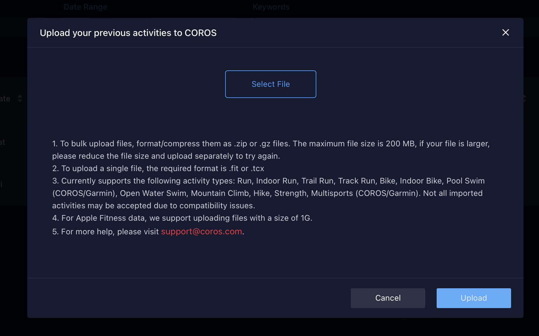 ***코로스는 .tcx / .fit 파일만 업로드 가능하다***