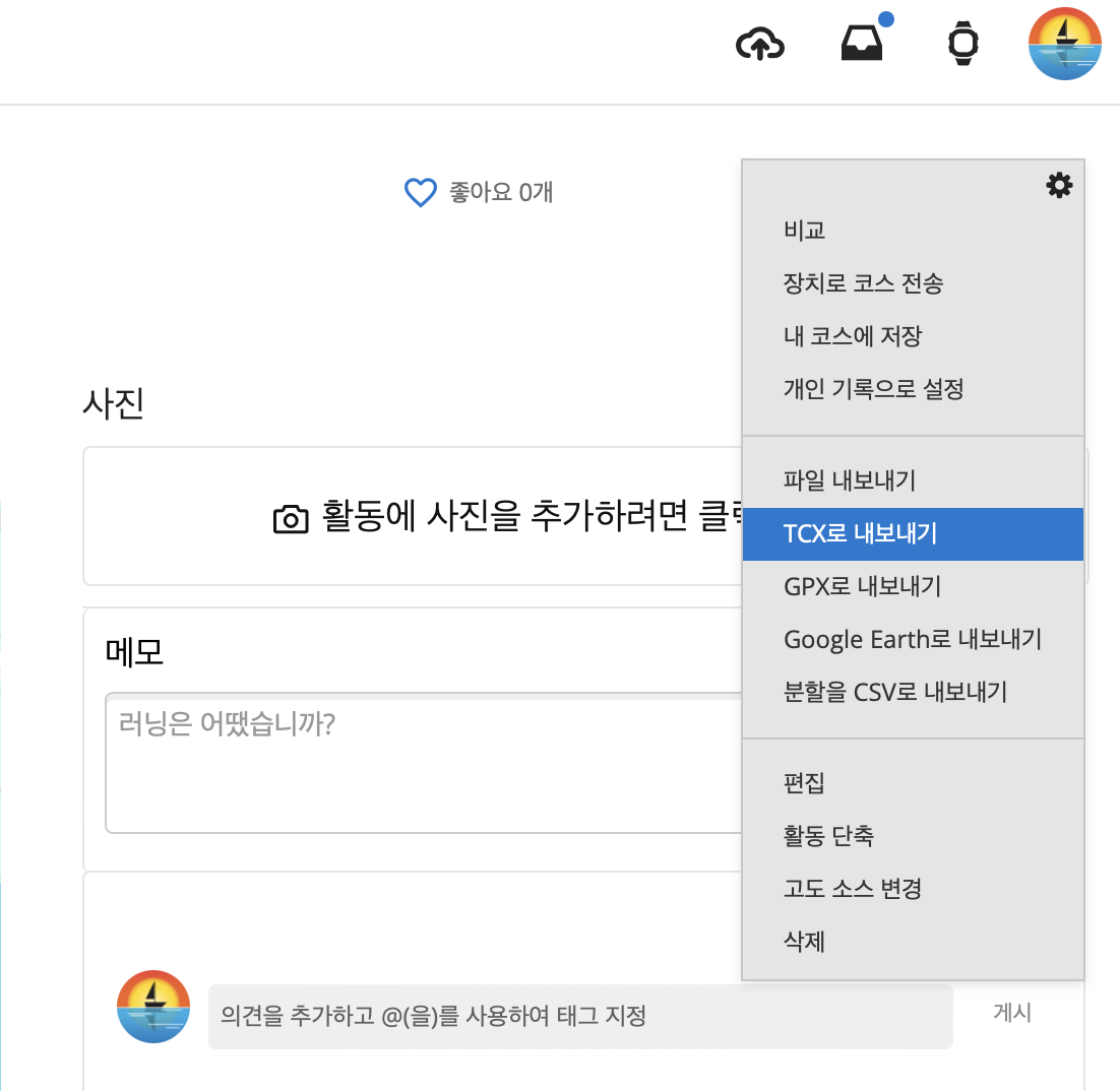 ***가민 커넥트 홈페이지에서 데이터를 TCX 파일로 내보내는 법***