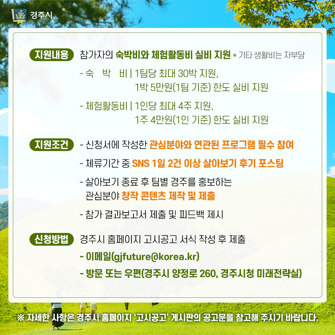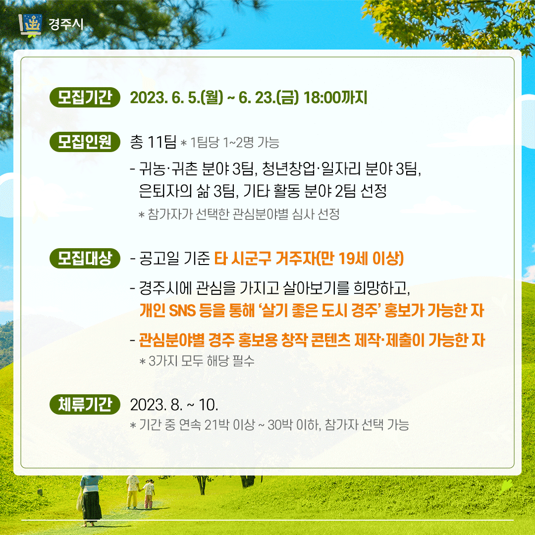 - 경주시에 관심을 가지고 살아보기를 희망하고, 개인 SNS 등을 통해‘살기 좋은 도시 경주’ 홍보가 가능한 자