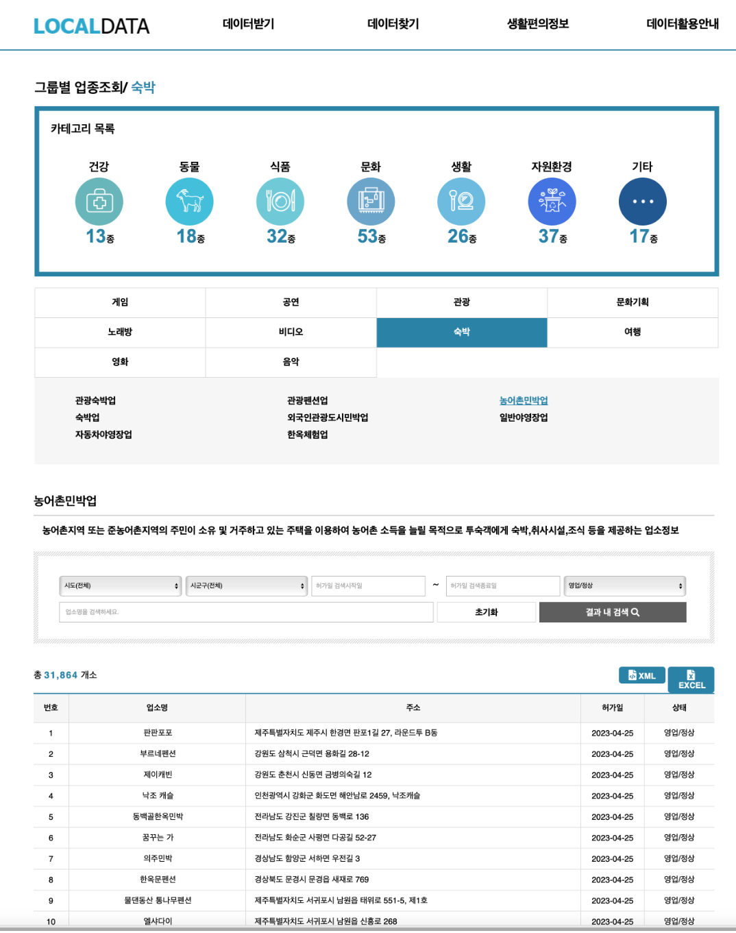 지방행정 인허가 데이터개방’ 사이트에서는 농어촌민박사업 정보뿐 아니라 일반숙박업과 외국인관광 도시민박업 등 11만4000여개 모든 신고·등록 숙박업 현황도 조회가 가능하다. 병의원·약국·음식점 정보 등 195종의 인허가 정보도 공개되고 있다