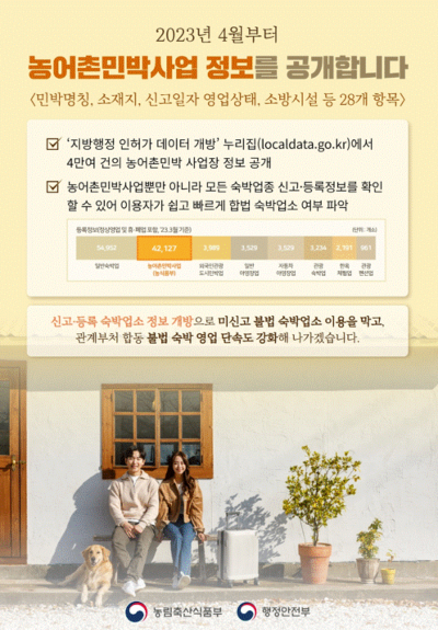 행정안전부와 농림축산식품부는 2023년 4월 17일부터 ‘지방행정 인허가 데이터개방’ 사이트(localdata.go.kr)에서 전국 농어촌민박 4만2127곳을 대상으로 사업장 명칭과 소재지, 영업상태, 소방시설 등을 포함한 28개 항목 정보를 확인할 수 있도록 했다
