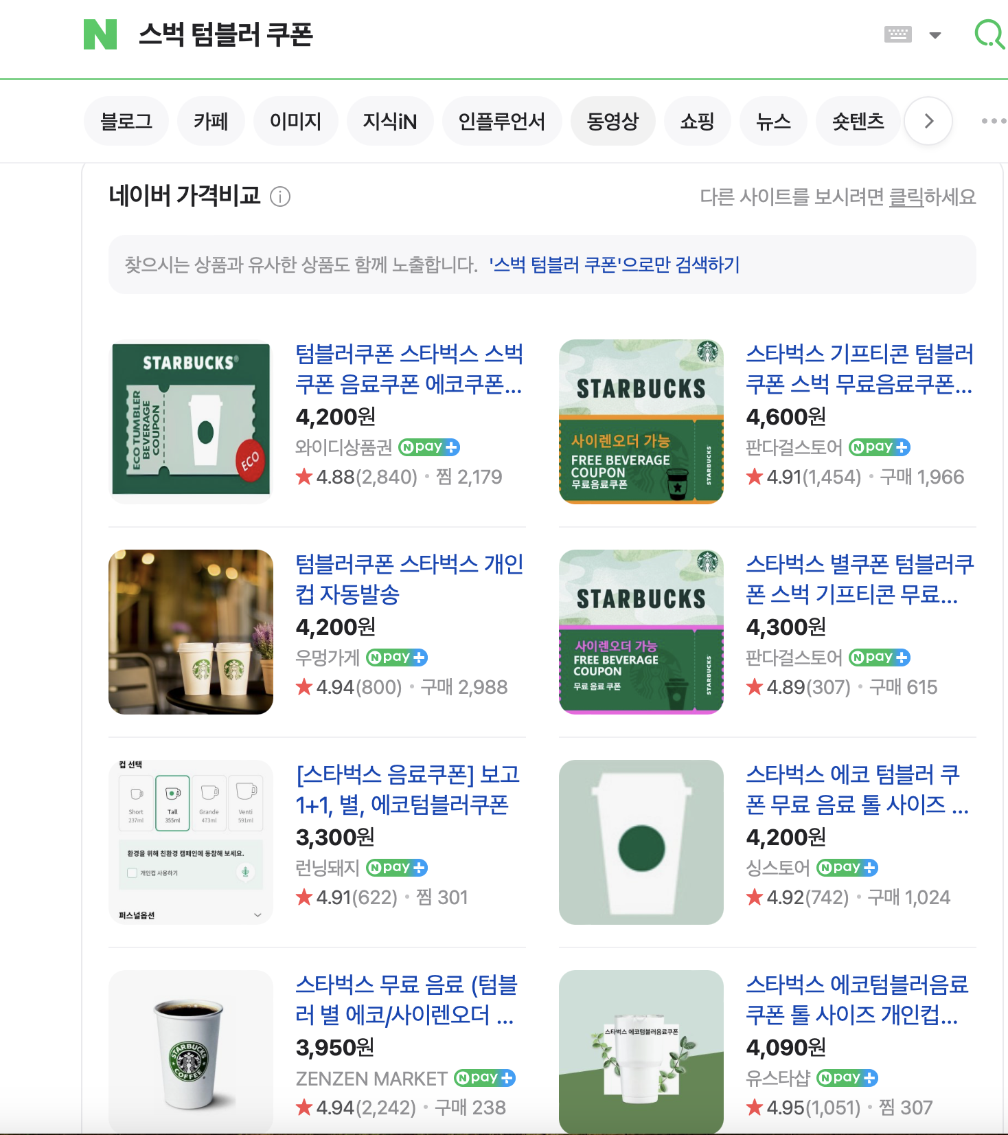 🚩검색창에 "스타벅스 텀블러 쿠폰"을 검색해서 최저가로 구매하고 문자로 쿠폰 받기