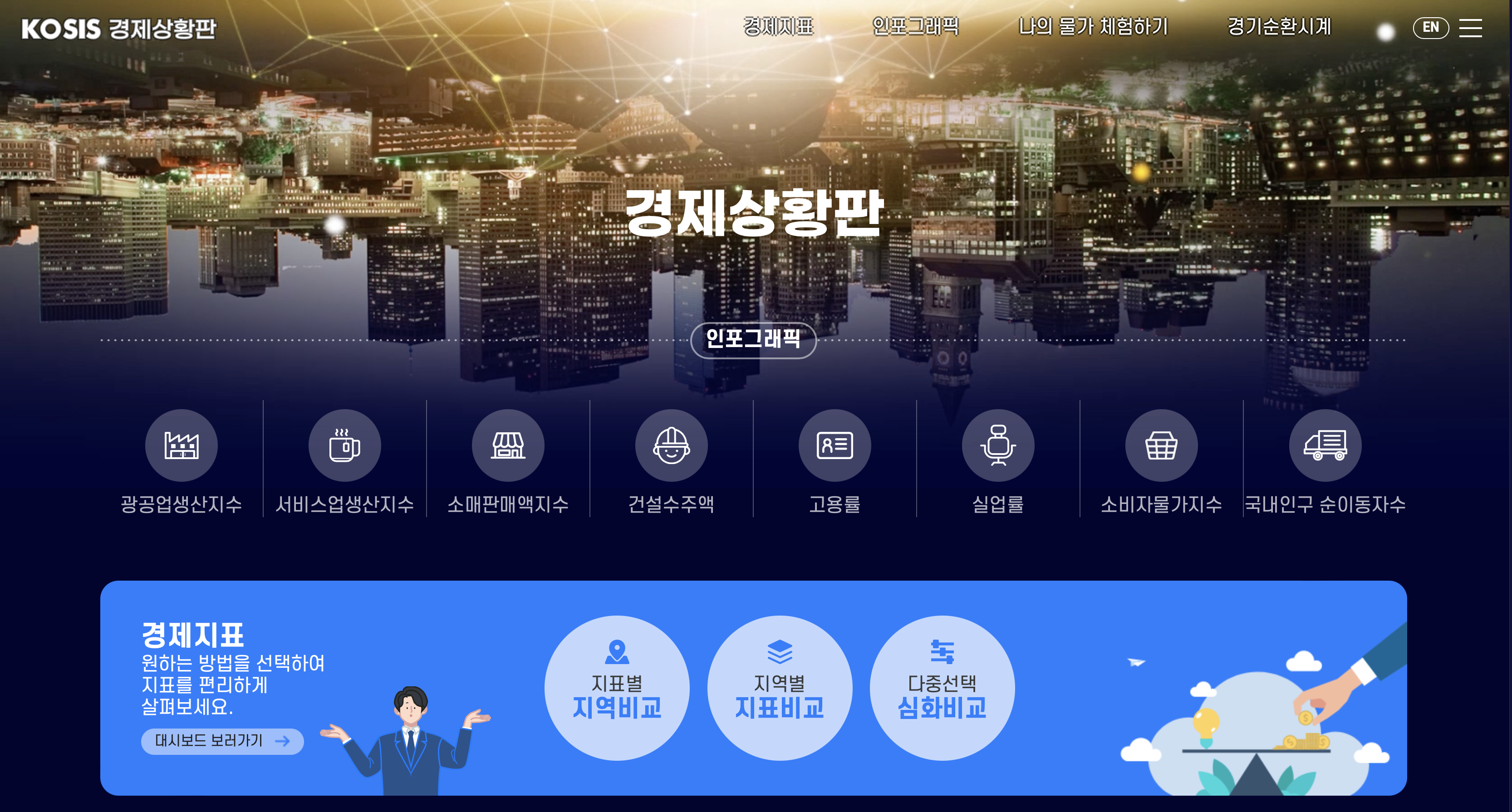 경제상황판은 통계청이 제공하는 경제 데이터 시각화 서비스로, 실시간 경제 동향을 파악할 수 있도록 다양한 통계를 종합하여 제공한다. 주요 경제 지표를 그래프와 차트 형태로 제공하며, 이를 통해 일반 국민, 연구자, 정책 결정자들이 보다 쉽게 경제를 이해하고 활용할 수 있도록 돕는다.